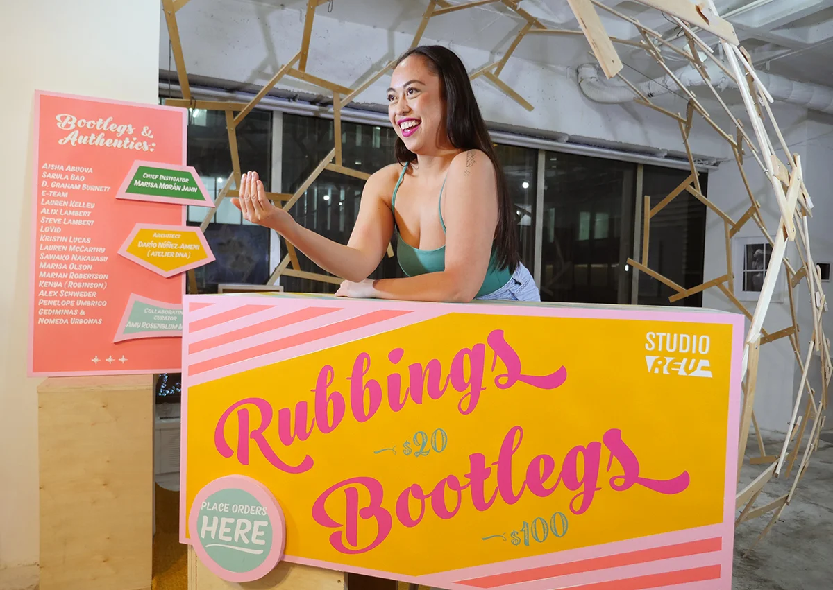 Caroline garcia wearing indigenous necklace and headdress from the philippines, in her performance for the tropical hypeisms (dexter cornelius/pact centre for emerging artists).